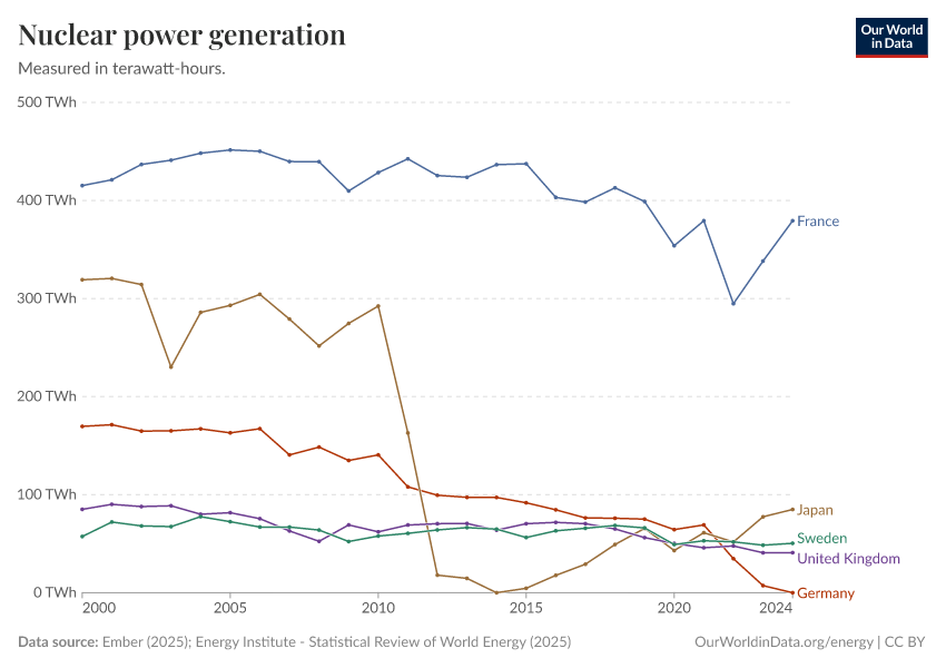 “Data Page: Electricity generation from nuclear”, part of the following publication: Hannah Ritchie, Pablo Rosado, and Max Roser (2023) - “Energy”. Data adapted from Ember, Energy Institute. Retrieved from https://archive.ourworldindata.org/20250909-093708/grapher/nuclear-energy-generation.html [online resource] (archived on September 9, 2025).How to cite this data