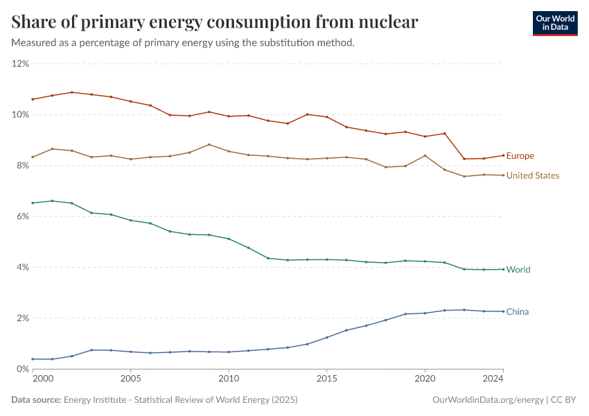 Energy Institute - Statistical Review of World Energy (2025) – with major processing by Our World in Data. “Share of primary energy consumption that comes from nuclear power – Using the substitution method” [dataset]. Energy Institute, “Statistical Review of World Energy” [original data]. Retrieved December 31, 2025 from https://archive.ourworldindata.org/20250909-093708/grapher/nuclear-primary-energy.html (archived on September 9, 2025).