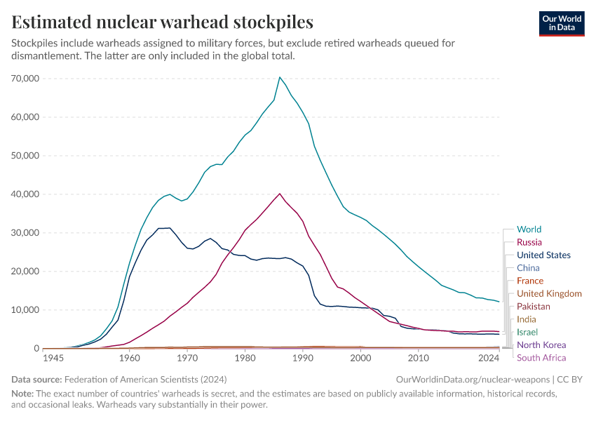 Federation of American Scientists (2024) – with minor processing by Our World in Data. “Estimated nuclear warhead stockpiles” [dataset]. Federation of American Scientists, “Estimated Global Nuclear Warhead Inventories” [original data]. Retrieved December 28, 2025 from https://archive.ourworldindata.org/20250909-093708/grapher/nuclear-warhead-stockpiles-lines.html (archived on September 9, 2025).