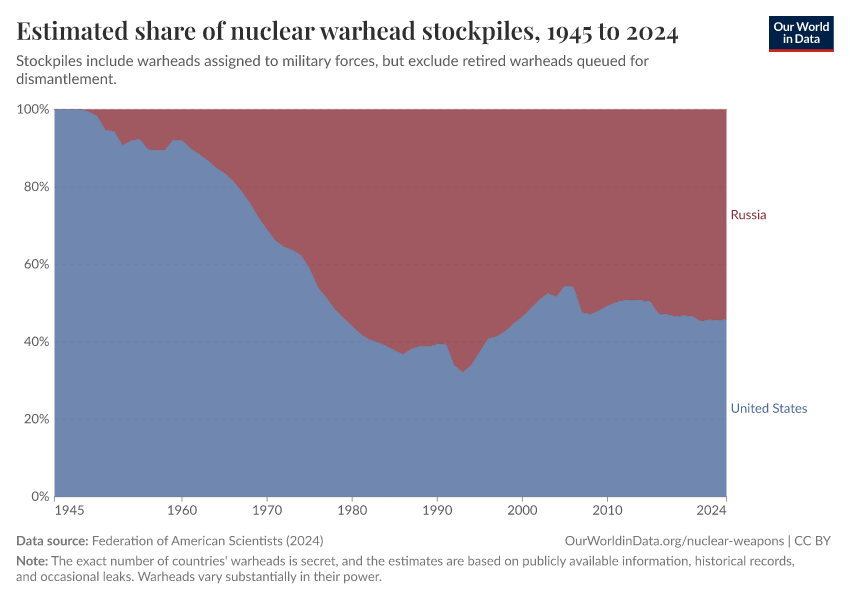 Federation of American Scientists (2024) – with minor processing by Our World in Data. “Estimated share of nuclear warhead stockpiles” [dataset]. Federation of American Scientists, “Estimated Global Nuclear Warhead Inventories” [original data]. Retrieved January 15, 2026 from https://archive.ourworldindata.org/20250909-093708/grapher/nuclear-warhead-stockpiles.html (archived on September 9, 2025).