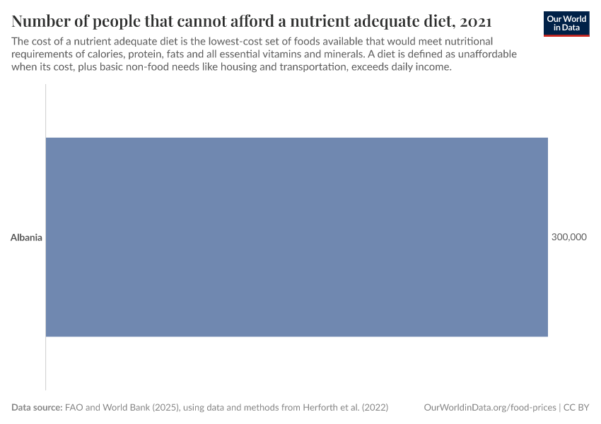 “Data Page: Number of people that cannot afford a nutrient adequate diet”, part of the following publication: Hannah Ritchie, Pablo Rosado, and Max Roser (2023) - “Food Prices”. Data adapted from Herforth et al. (2022), adapted by World Bank. Retrieved from https://archive.ourworldindata.org/20251013-180113/grapher/number-nutritional-diet-unaffordable.html [online resource] (archived on October 13, 2025).How to cite this data
