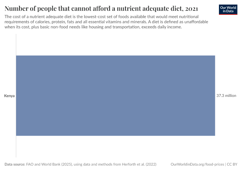 - This indicator is calculated as the percentage of a country's population that is unable to afford a nutrient-adequate diet, multiplied by the country's population.