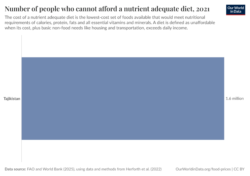 “Data Page: Number of people that cannot afford a nutrient adequate diet”, part of the following publication: Hannah Ritchie, Pablo Rosado, and Max Roser (2023) - “Food Prices”. Data adapted from Herforth et al. (2022), adapted by World Bank. Retrieved from https://archive.ourworldindata.org/20251013-180113/grapher/number-nutritional-diet-unaffordable.html [online resource] (archived on October 13, 2025).How to cite this data