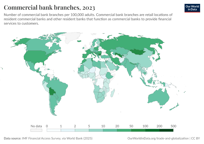 “Data Page: Commercial bank branches”. Our World in Data (2026). Data adapted from IMF Financial Access Survey, via World Bank. Retrieved from https://archive.ourworldindata.org/20260112-111535/grapher/number-of-commercial-bank-branches-per-100000-adults.html [online resource] (archived on January 12, 2026).