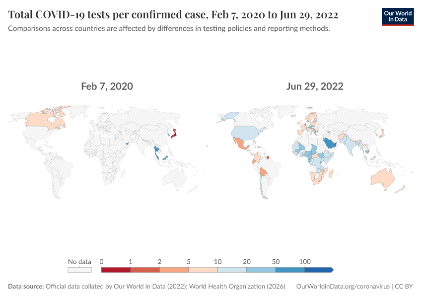 “Data Page: Total COVID-19 tests per confirmed case”. Our World in Data (2026). Data adapted from Official data collated by Our World in Data, World Health Organization. Retrieved from https://archive.ourworldindata.org/20260109-063243/grapher/number-of-covid-19-tests-per-confirmed-case-bar-chart.html [online resource] (archived on January 9, 2026).How to cite this data