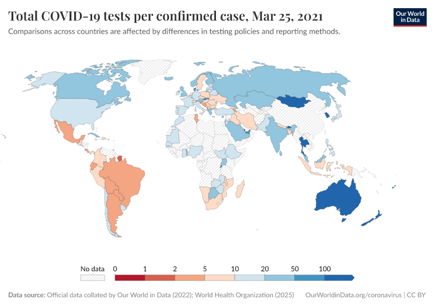 “Data Page: Total COVID-19 tests per confirmed case”. Our World in Data (2025). Data adapted from Official data collated by Our World in Data, World Health Organization. Retrieved from https://archive.ourworldindata.org/20251213-063349/grapher/number-of-covid-19-tests-per-confirmed-case-bar-chart.html [online resource] (archived on December 13, 2025).How to cite this data