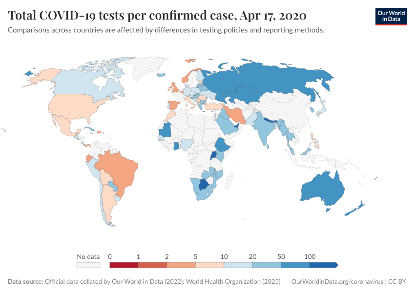 “Data Page: Total COVID-19 tests per confirmed case”. Our World in Data (2025). Data adapted from Official data collated by Our World in Data, World Health Organization. Retrieved from https://archive.ourworldindata.org/20251226-063332/grapher/number-of-covid-19-tests-per-confirmed-case-bar-chart.html [online resource] (archived on December 26, 2025).How to cite this data
