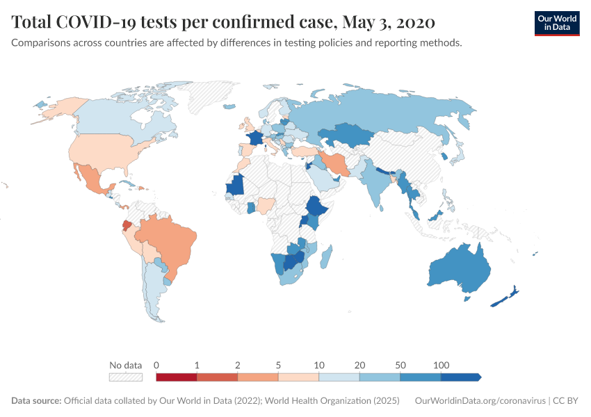 “Data Page: Total COVID-19 tests per confirmed case”. Our World in Data (2025). Data adapted from Official data collated by Our World in Data, World Health Organization. Retrieved from https://archive.ourworldindata.org/20251219-063428/grapher/number-of-covid-19-tests-per-confirmed-case-bar-chart.html [online resource] (archived on December 19, 2025).How to cite this data