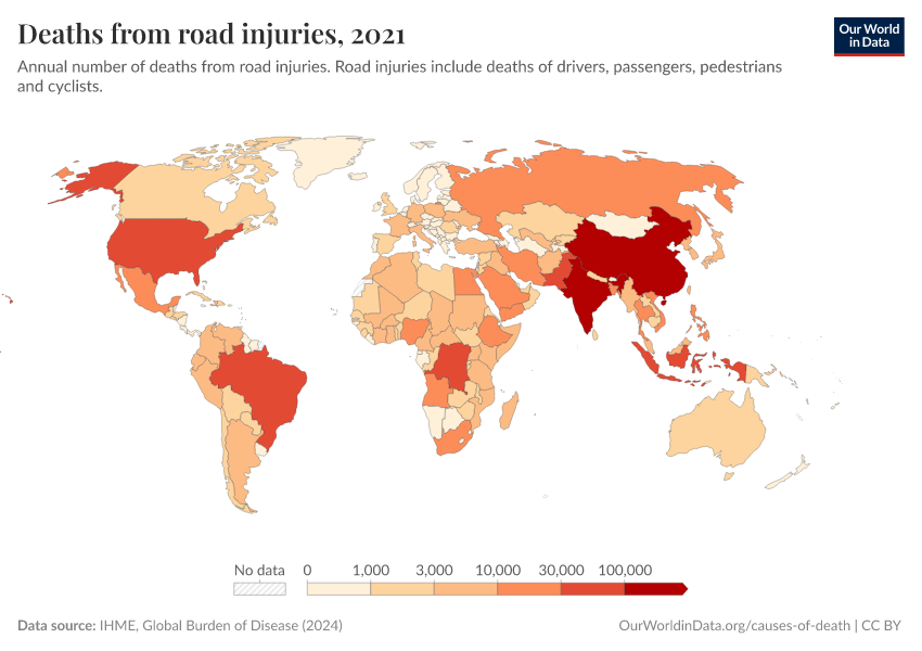 IHME, Global Burden of Disease (2024) – with minor processing by Our World in Data. “Deaths from road injuries” [dataset]. IHME, Global Burden of Disease, “Global Burden of Disease - Deaths and DALYs” [original data]. Retrieved December 31, 2025 from https://archive.ourworldindata.org/20250909-093708/grapher/number-of-deaths-from-road-injuries.html (archived on September 9, 2025).
