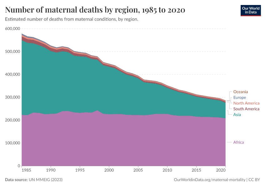 UN MMEIG (2023) – processed by Our World in Data. “Number of maternal deaths by region” [dataset]. UN MMEIG (WHO, UNICEF, UNFPA, World Bank Group and UNDESA/ Population Division), “Trends in maternal mortality 2020” [original data]. Retrieved March 6, 2026 from https://archive.ourworldindata.org/20260304-094028/grapher/number-of-maternal-deaths-by-region.html (archived on March 4, 2026).