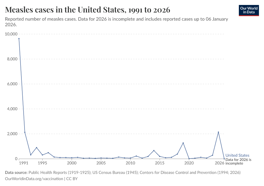 Public Health Reports (1919-1925); US Census Bureau (1945); Centers for Disease Control and Prevention (1994; 2026) – processed by Our World in Data. “Measles cases in the United States” [dataset]. Public Health Reports; US Census Bureau; Centers for Disease Control and Prevention, “Historical Measles Cases - United States”; Centers for Disease Control and Prevention (CDC), “CDC Yearly measles cases (1985-present)” [original data]. Retrieved January 9, 2026 from https://archive.ourworldindata.org/20260109-063243/grapher/number-of-measles-cases.html (archived on January 9, 2026).