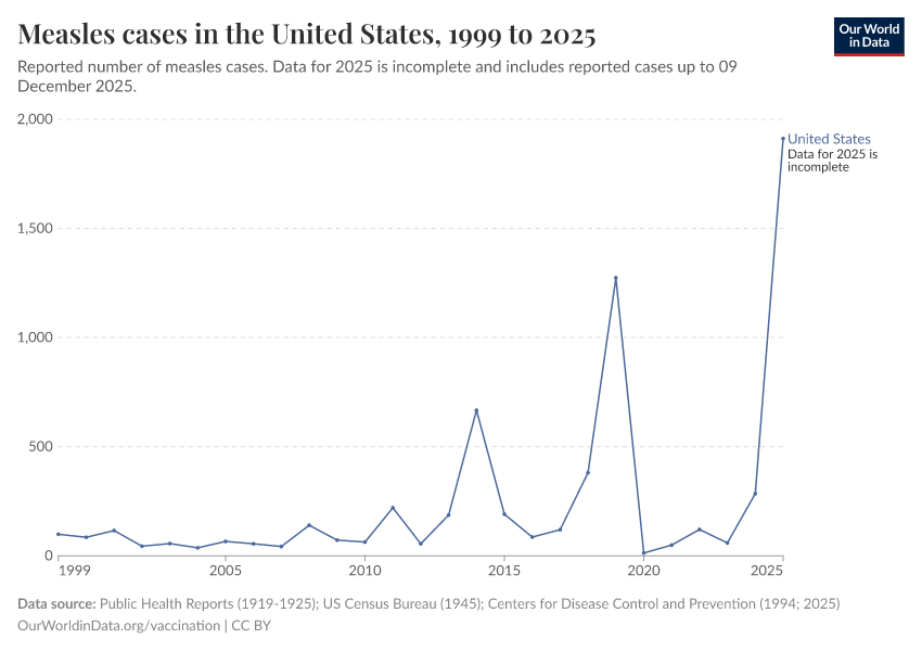 Public Health Reports (1919-1925); US Census Bureau (1945); Centers for Disease Control and Prevention (1994; 2025) – processed by Our World in Data. “Measles cases in the United States” [dataset]. Public Health Reports; US Census Bureau; Centers for Disease Control and Prevention, “Historical Measles Cases - United States”; Centers for Disease Control and Prevention (CDC), “CDC Yearly measles cases (1985-present)” [original data]. Retrieved December 16, 2025 from https://archive.ourworldindata.org/20251216-063335/grapher/number-of-measles-cases.html (archived on December 16, 2025).