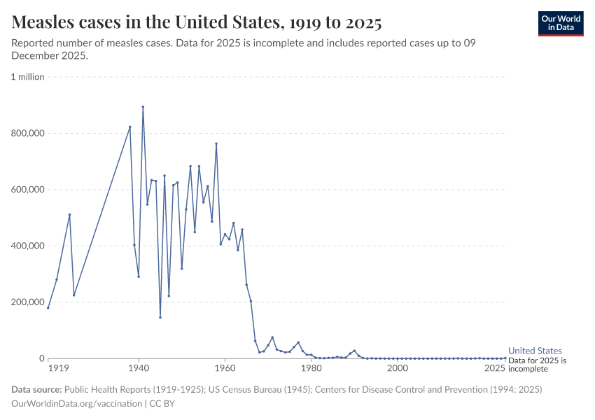Public Health Reports (1919-1925); US Census Bureau (1945); Centers for Disease Control and Prevention (1994; 2025) – processed by Our World in Data. “Measles cases in the United States” [dataset]. Public Health Reports; US Census Bureau; Centers for Disease Control and Prevention, “Historical Measles Cases - United States”; Centers for Disease Control and Prevention (CDC), “CDC Yearly measles cases (1985-present)” [original data]. Retrieved December 15, 2025 from https://archive.ourworldindata.org/20251215-063346/grapher/number-of-measles-cases.html (archived on December 15, 2025).