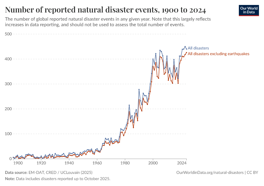 EM-DAT, CRED / UCLouvain (2025) – with major processing by Our World in Data. “Number of reported natural disaster events – EM-DAT” [dataset]. EM-DAT, “The International Disasters Database” [original data]. Retrieved January 13, 2026 from https://archive.ourworldindata.org/20260112-111535/grapher/number-of-natural-disaster-events.html (archived on January 12, 2026).