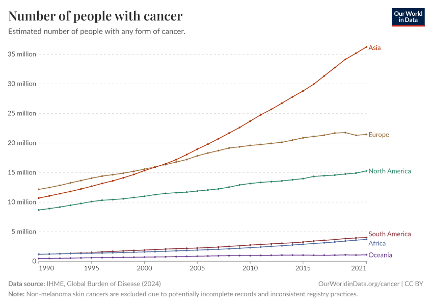 “Data Page: Number of people with cancer”, part of the following publication: Esteban Ortiz-Ospina and Max Roser (2016) - “Global Health”. Data adapted from IHME, Global Burden of Disease. Retrieved from https://archive.ourworldindata.org/20250909-093708/grapher/number-of-people-with-cancer.html [online resource] (archived on September 9, 2025).