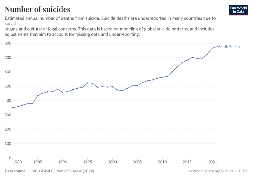 IHME, Global Burden of Disease (2024) – with minor processing by Our World in Data. “Number of suicides” [dataset]. IHME, Global Burden of Disease, “Global Burden of Disease - Deaths and DALYs” [original data]. Retrieved December 5, 2025 from https://archive.ourworldindata.org/20250909-093708/grapher/number-suicide-deaths.html (archived on September 9, 2025).