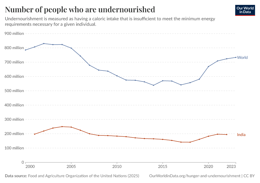 Food and Agriculture Organization of the United Nations (2025) – with major processing by Our World in Data. “Number of people that are undernourished – UN FAO” [dataset]. Food and Agriculture Organization of the United Nations, “SDG Indicators” [original data]. Retrieved January 16, 2026 from https://archive.ourworldindata.org/20250909-093708/grapher/number-undernourished.html (archived on September 9, 2025).
