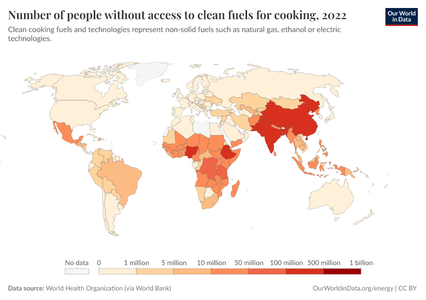 World Health Organization (via World Bank) – with major processing by Our World in Data. “Number of people without access to clean fuels for cooking – World Bank” [dataset]. Tracking SDG 7: The Energy Progress Report, via World Bank, “World Development Indicators 122”; United Nations Population Division, national statistical offices, and Eurostat, via World Bank, “World Development Indicators 122” [original data]. Retrieved January 16, 2026 from https://archive.ourworldindata.org/20260112-111535/grapher/number-without-clean-cooking-fuel.html (archived on January 12, 2026).
