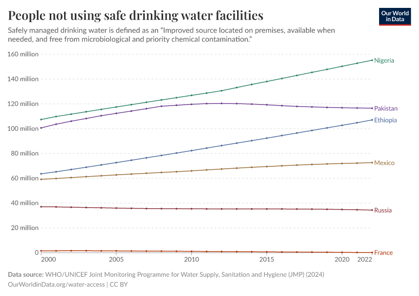 “Data Page: People not using safe drinking water facilities”, part of the following publication: Hannah Ritchie, Fiona Spooner, and Max Roser (2021) - “Clean Water and Sanitation”. Data adapted from WHO/UNICEF Joint Monitoring Programme for Water Supply, Sanitation and Hygiene (JMP). Retrieved from https://archive.ourworldindata.org/20250909-093708/grapher/number-without-safe-drinking-water.html [online resource] (archived on September 9, 2025).How to cite this data
