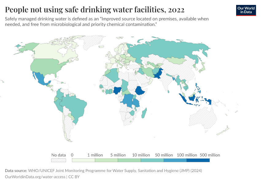 WHO/UNICEF Joint Monitoring Programme for Water Supply, Sanitation and Hygiene (JMP) (2024) – with major processing by Our World in Data. “People not using safe drinking water facilities” [dataset]. WHO/UNICEF Joint Monitoring Programme for Water Supply, Sanitation and Hygiene (JMP), “WHO/UNICEF Joint Monitoring Programme for Water Supply, Sanitation and Hygiene (JMP) - Households”; WHO/UNICEF Joint Monitoring Programme for Water Supply, Sanitation and Hygiene (JMP), “WHO/UNICEF Joint Monitoring Programme for Water Supply, Sanitation and Hygiene (JMP) - Households - Regions” [original data]. Retrieved January 1, 2026 from https://archive.ourworldindata.org/20250909-093708/grapher/number-without-safe-drinking-water.html (archived on September 9, 2025).