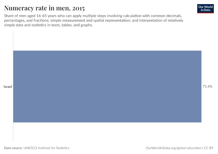 “Data Page: Numeracy rate in men”. Our World in Data (2025). Data adapted from UNESCO Institute for Statistics. Retrieved from https://archive.ourworldindata.org/20251120-211749/grapher/numeracy-rate-in-adult-men.html [online resource] (archived on November 20, 2025).How to cite this data