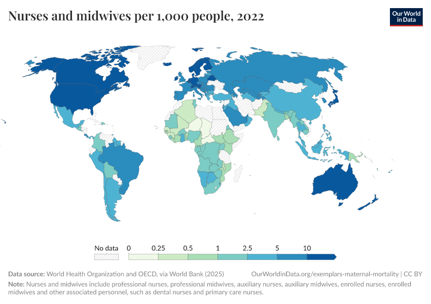 “Data Page: Nurses and midwives per 1,000 people”. Our World in Data (2025). Data adapted from World Health Organization and OECD, via World Bank. Retrieved from https://archive.ourworldindata.org/20250916-102301/grapher/nurses-and-midwives-per-1000-people.html [online resource] (archived on September 16, 2025).How to cite this data
