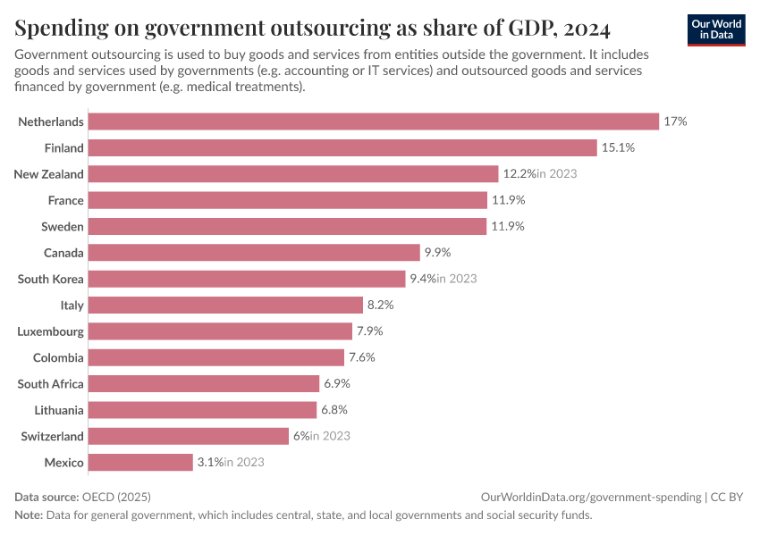 OECD (2025) – with minor processing by Our World in Data. “Spending on government outsourcing as share of GDP – OECD” [dataset]. OECD, “Public finance main indicators - Government at a glance, Yearly updates”; OECD, “Size of public procurement - Government at a glance indicators, Yearly updates”; OECD, “Public finance by economic transaction - Government at a glance indicators, Yearly updates”; OECD, “Public finance by function - Government at a glance indicators, Yearly updates” [original data]. Retrieved January 16, 2026 from https://archive.ourworldindata.org/20250909-093708/grapher/oecd-expenditures-on-government-outsourcing-gdp.html (archived on September 9, 2025).