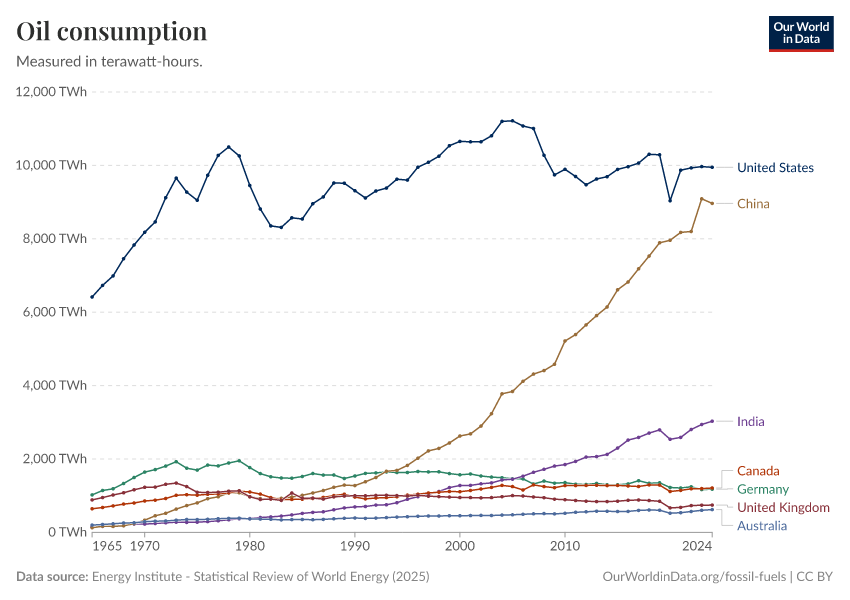 “Data Page: Oil consumption”, part of the following publication: Hannah Ritchie, Pablo Rosado, and Max Roser (2023) - “Energy”. Data adapted from Energy Institute. Retrieved from https://archive.ourworldindata.org/20250909-093708/grapher/oil-consumption-by-country.html [online resource] (archived on September 9, 2025).How to cite this data