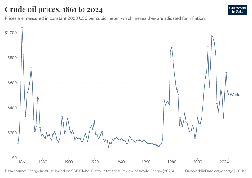 “Data Page: Oil price - Crude prices since 1861”, part of the following publication: Hannah Ritchie, Pablo Rosado, and Max Roser (2023) - “Energy”. Data adapted from Energy Institute. Retrieved from https://archive.ourworldindata.org/20250909-093708/grapher/oil-prices-inflation-adjusted.html [online resource] (archived on September 9, 2025).How to cite this data