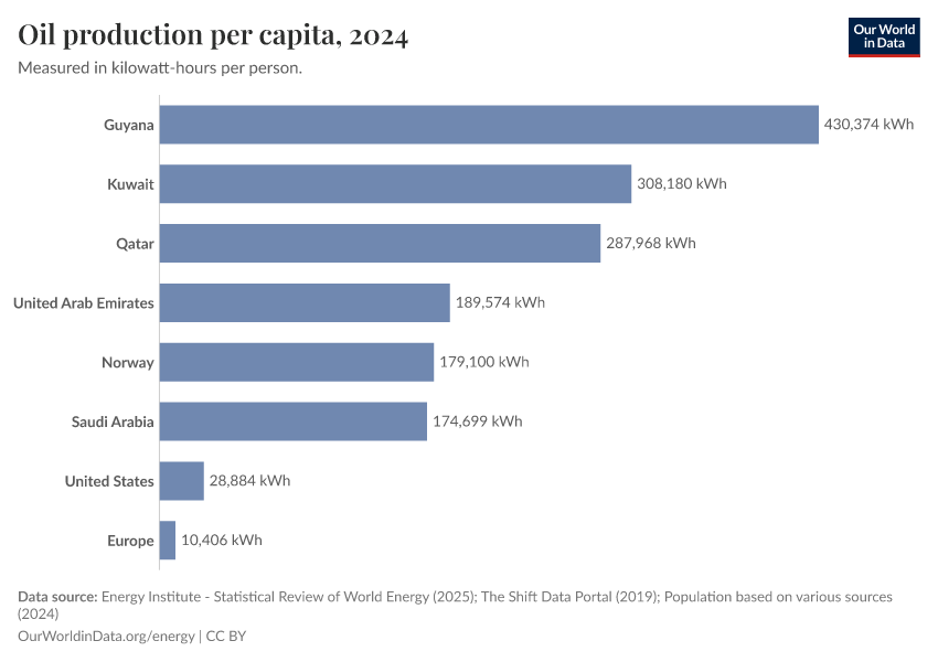Energy Institute - Statistical Review of World Energy (2025); The Shift Data Portal (2019); Population based on various sources (2024) – with major processing by Our World in Data. “Oil production per capita” [dataset]. Energy Institute, “Statistical Review of World Energy”; The Shift Data Portal, “Energy production from fossil fuels”; Various sources, “Population” [original data]. Retrieved April 24, 2026 from https://archive.ourworldindata.org/20260417-112857/grapher/oil-prod-per-capita.html (archived on April 17, 2026).Download