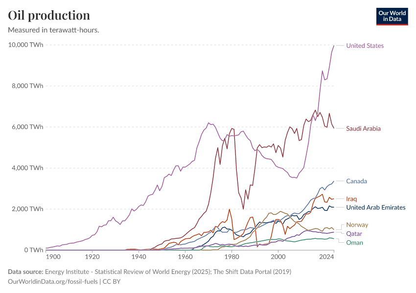 “Data Page: Oil production”, part of the following publication: Hannah Ritchie, Pablo Rosado, and Max Roser (2023) - “Energy”. Data adapted from Energy Institute, The Shift Data Portal. Retrieved from https://archive.ourworldindata.org/20260119-070102/grapher/oil-production-by-country.html [online resource] (archived on January 19, 2026).How to cite this data