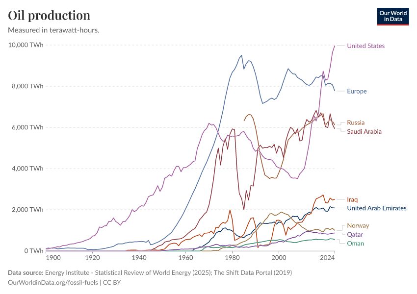 “Data Page: Oil production”, part of the following publication: Hannah Ritchie, Pablo Rosado, and Max Roser (2023) - “Energy”. Data adapted from Energy Institute, The Shift Data Portal. Retrieved from https://archive.ourworldindata.org/20250909-093708/grapher/oil-production-by-country.html [online resource] (archived on September 9, 2025).How to cite this data