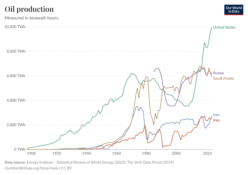 “Data Page: Oil production”, part of the following publication: Hannah Ritchie, Pablo Rosado, and Max Roser (2023) - “Energy”. Data adapted from Energy Institute, The Shift Data Portal. Retrieved from https://archive.ourworldindata.org/20250909-093708/grapher/oil-production-by-country.html [online resource] (archived on September 9, 2025).How to cite this data