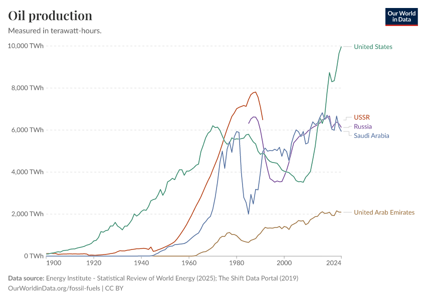 Energy Institute - Statistical Review of World Energy (2025); The Shift Data Portal (2019) – with major processing by Our World in Data. “Oil production” [dataset]. Energy Institute, “Statistical Review of World Energy”; The Shift Data Portal, “Energy production from fossil fuels” [original data]. Retrieved January 16, 2026 from https://archive.ourworldindata.org/20250909-093708/grapher/oil-production-by-country.html (archived on September 9, 2025).