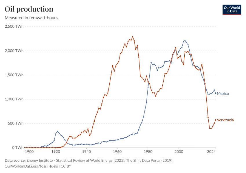 “Data Page: Oil production”, part of the following publication: Hannah Ritchie, Pablo Rosado, and Max Roser (2023) - “Energy”. Data adapted from Energy Institute, The Shift Data Portal. Retrieved from https://archive.ourworldindata.org/20260119-070102/grapher/oil-production-by-country.html [online resource] (archived on January 19, 2026).How to cite this data
