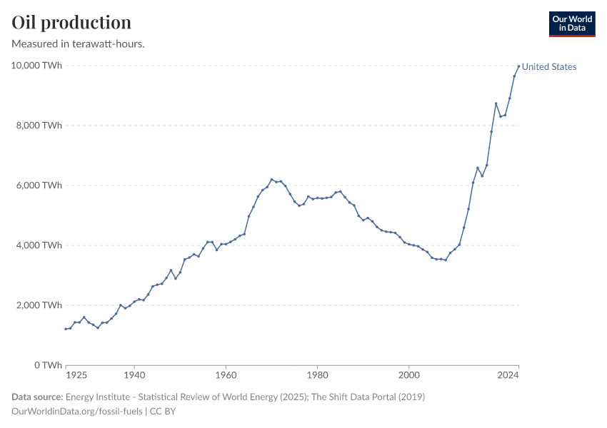“Data Page: Oil production”, part of the following publication: Hannah Ritchie, Pablo Rosado, and Max Roser (2023) - “Energy”. Data adapted from Energy Institute, The Shift Data Portal. Retrieved from https://archive.ourworldindata.org/20250909-093708/grapher/oil-production-by-country.html [online resource] (archived on September 9, 2025).How to cite this data