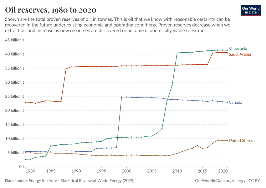 Energy Institute - Statistical Review of World Energy (2025) – with major processing by Our World in Data. “Oil proved reserves” [dataset]. Energy Institute, “Statistical Review of World Energy” [original data]. Retrieved April 3, 2026 from https://archive.ourworldindata.org/20260325-120949/grapher/oil-proved-reserves.html (archived on March 25, 2026).