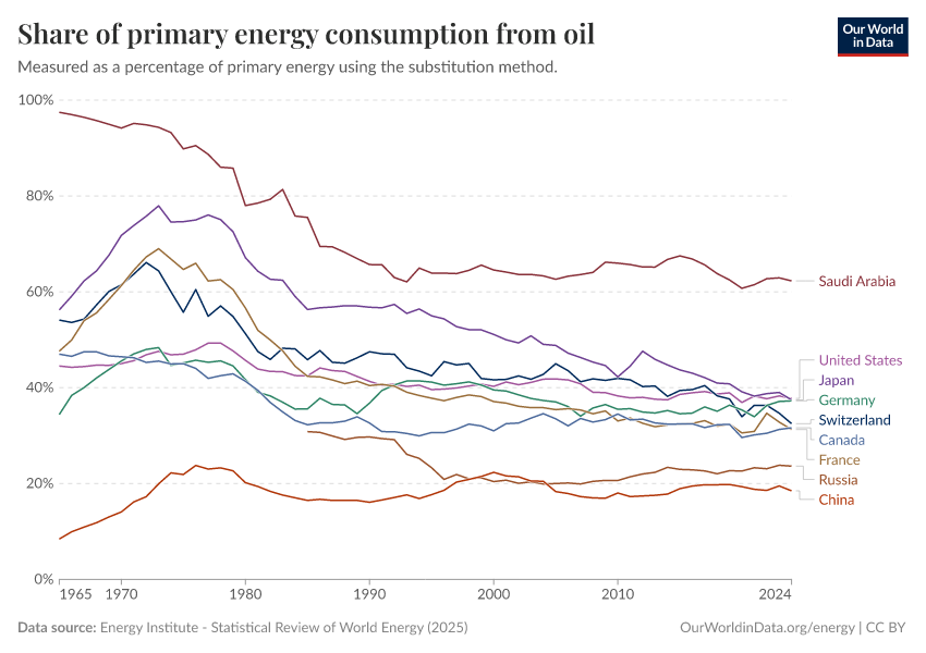Energy Institute - Statistical Review of World Energy (2025) – with major processing by Our World in Data. “Share of primary energy consumption that comes from oil – Using the substitution method” [dataset]. Energy Institute, “Statistical Review of World Energy” [original data]. Retrieved November 7, 2025 from https://archive.ourworldindata.org/20250909-093708/grapher/oil-share-energy.html (archived on September 9, 2025).