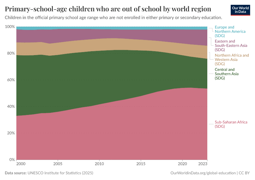“Data Page: Out-of-school children of primary school age”, part of the following publication: Hannah Ritchie, Veronika Samborska, Natasha Ahuja, Esteban Ortiz-Ospina, and Max Roser (2023) - “Global Education”. Data adapted from UNESCO Institute for Statistics. Retrieved from https://archive.ourworldindata.org/20250909-093708/grapher/out-of-school-children-of-primary-school-age-by-world-region.html [online resource] (archived on September 9, 2025).How to cite this data