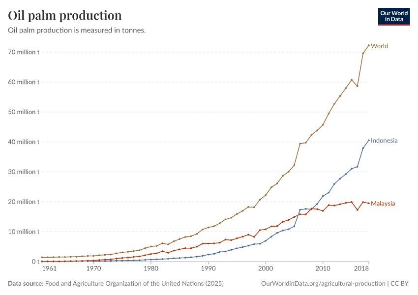 “Data Page: Palm oil production”, part of the following publication: Hannah Ritchie, Pablo Rosado, and Max Roser (2023) - “Agricultural Production”. Data adapted from Food and Agriculture Organization of the United Nations. Retrieved from https://archive.ourworldindata.org/20260119-235736/grapher/palm-oil-production.html [online resource] (archived on January 19, 2026).How to cite this data