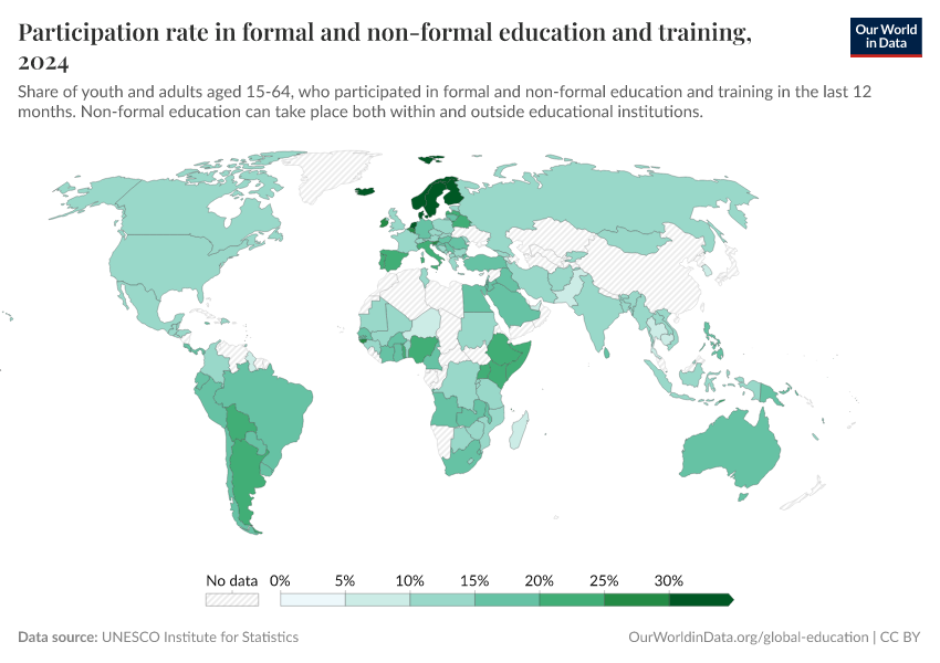 “Data Page: Participation rate in formal and non-formal education and training”. Our World in Data (2025). Data adapted from UNESCO Institute for Statistics. Retrieved from https://archive.ourworldindata.org/20251125-165536/grapher/participation-rate-in-formal-and-non-formal-education-and-training.html [online resource] (archived on November 25, 2025).How to cite this data