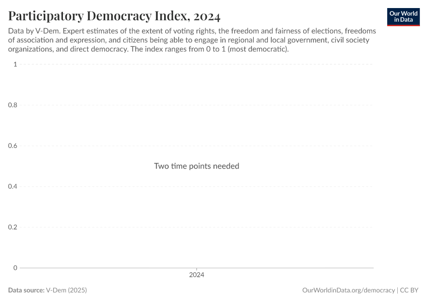 “Data Page: Participatory democracy index”, part of the following publication: Bastian Herre, Lucas Rodés-Guirao, and Esteban Ortiz-Ospina (2013) - “Democracy”. Data adapted from V-Dem. Retrieved from https://archive.ourworldindata.org/20250925-233948/grapher/participatory-democracy-index.html [online resource] (archived on September 25, 2025).How to cite this data