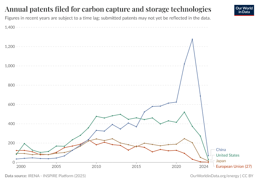 IRENA - INSPIRE Platform (2025) – with major processing by Our World in Data. “Annual patents filed for carbon capture and storage technologies” [dataset]. IRENA, “Renewable Energy Patents” [original data]. Retrieved December 6, 2025 from https://archive.ourworldindata.org/20250909-093708/grapher/patents-ccs.html (archived on September 9, 2025).