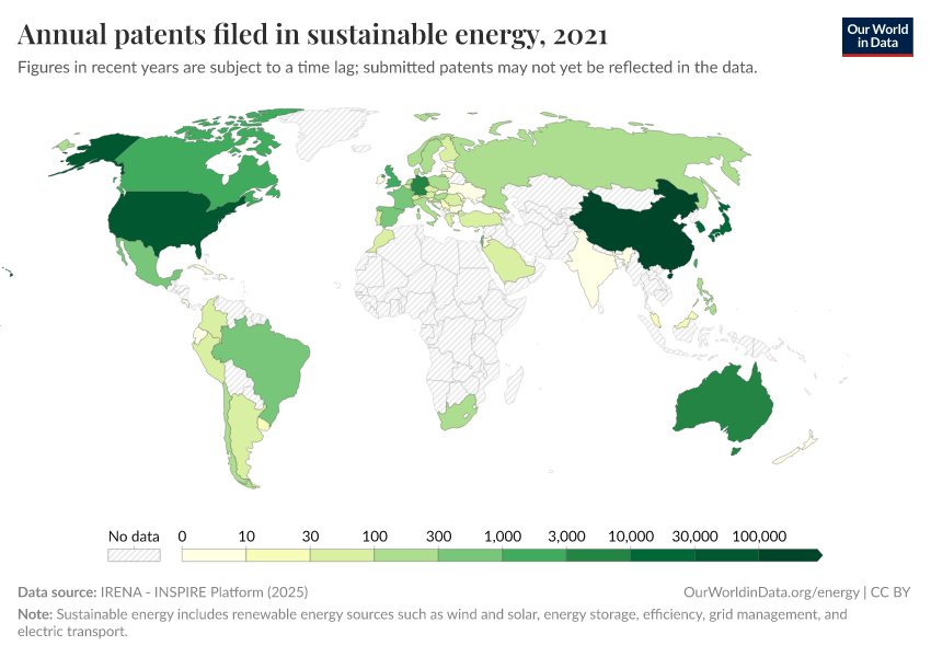 “Data Page: Annual patents filed in sustainable energy”, part of the following publication: Hannah Ritchie, Pablo Rosado, and Max Roser (2023) - “Energy”. Data adapted from IRENA. Retrieved from https://archive.ourworldindata.org/20250909-093708/grapher/patents-for-renewables-by-country.html [online resource] (archived on September 9, 2025).How to cite this data