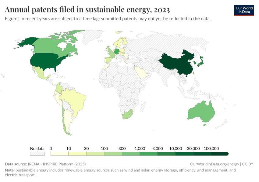 IRENA - INSPIRE Platform (2025) – with major processing by Our World in Data. “Annual patents filed in sustainable energy” [dataset]. IRENA, “Renewable Energy Patents” [original data]. Retrieved December 7, 2025 from https://archive.ourworldindata.org/20250909-093708/grapher/patents-for-renewables-by-country.html (archived on September 9, 2025).