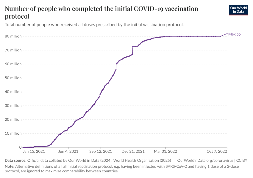 “Data Page: Number of people who completed the initial COVID-19 vaccination protocol”, part of the following publication: Edouard Mathieu, Hannah Ritchie, Lucas Rodés-Guirao, Cameron Appel, Daniel Gavrilov, Charlie Giattino, Joe Hasell, Bobbie Macdonald, Saloni Dattani, Diana Beltekian, Esteban Ortiz-Ospina, and Max Roser (2020) - “COVID-19 Pandemic”. Data adapted from Official data collated by Our World in Data, World Health Organisation. Retrieved from https://archive.ourworldindata.org/20260304-094028/grapher/people-fully-vaccinated-covid.html [online resource] (archived on March 4, 2026).