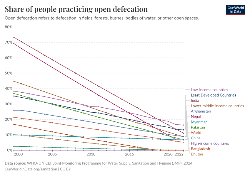 WHO/UNICEF Joint Monitoring Programme for Water Supply, Sanitation and Hygiene (JMP) (2024) – with major processing by Our World in Data. “Share of people practicing open defecation” [dataset]. WHO/UNICEF Joint Monitoring Programme for Water Supply, Sanitation and Hygiene (JMP), “WHO/UNICEF Joint Monitoring Programme for Water Supply, Sanitation and Hygiene (JMP) - Households”; WHO/UNICEF Joint Monitoring Programme for Water Supply, Sanitation and Hygiene (JMP), “WHO/UNICEF Joint Monitoring Programme for Water Supply, Sanitation and Hygiene (JMP) - Households - Regions” [original data]. Retrieved December 14, 2025 from https://archive.ourworldindata.org/20250909-093708/grapher/people-practicing-open-defecation-of-population.html (archived on September 9, 2025).