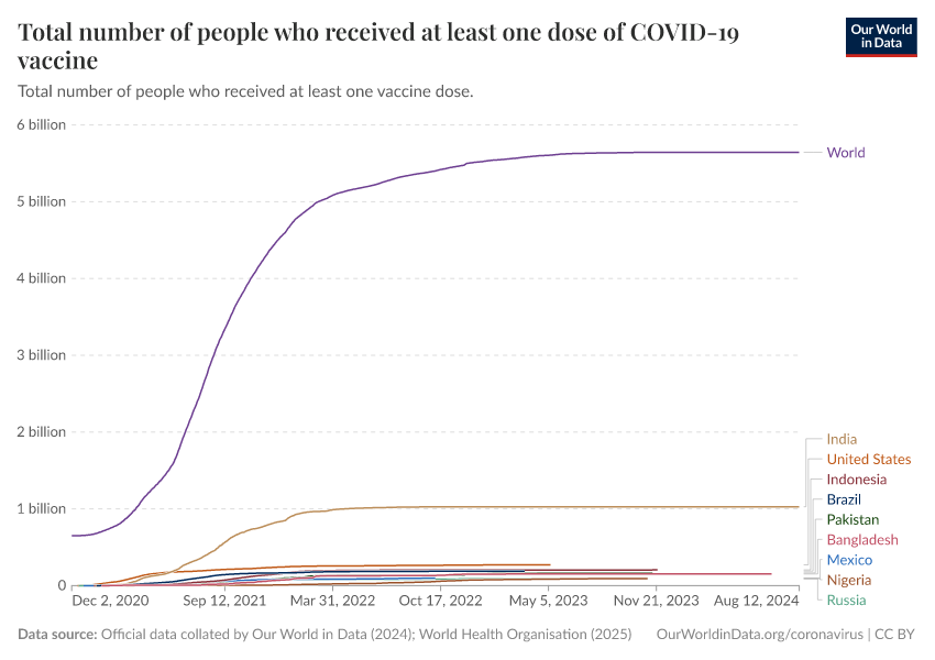 Official data collated by Our World in Data (2024); World Health Organisation (2025) – with major processing by Our World in Data. “Total number of people who received at least one dose of COVID-19 vaccine” [dataset]. Official data collated by Our World in Data, “COVID-19, vaccinations”; World Health Organisation, “COVID-19, vaccinations (WHO)” [original data]. Retrieved December 6, 2025 from https://archive.ourworldindata.org/20250909-093708/grapher/people-vaccinated-covid.html (archived on September 9, 2025).