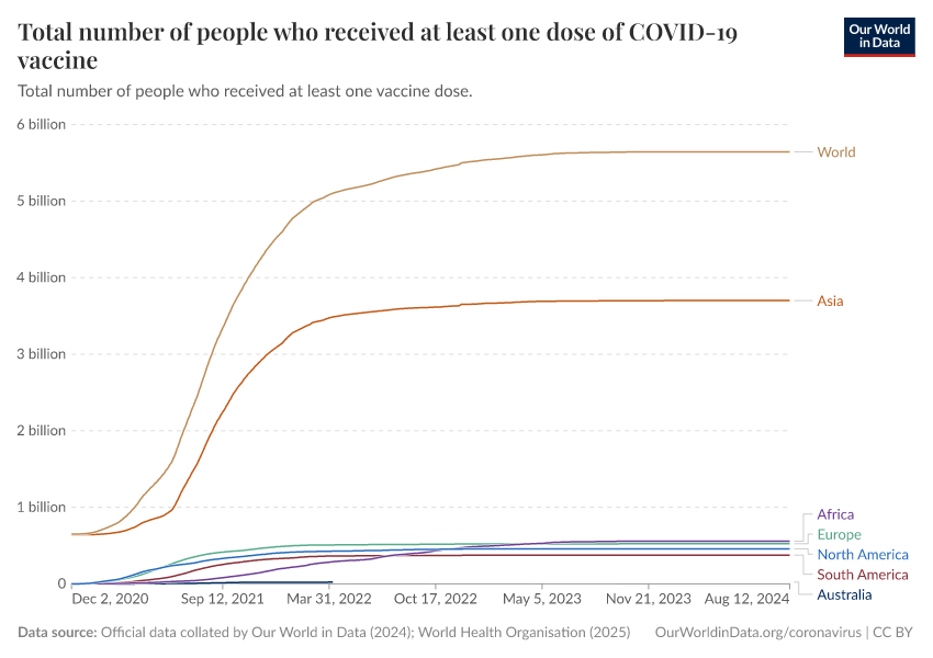 Official data collated by Our World in Data (2024); World Health Organisation (2025) – with major processing by Our World in Data. “Total number of people who received at least one dose of COVID-19 vaccine” [dataset]. Official data collated by Our World in Data, “COVID-19, vaccinations”; World Health Organisation, “COVID-19, vaccinations (WHO)” [original data]. Retrieved December 7, 2025 from https://archive.ourworldindata.org/20250909-093708/grapher/people-vaccinated-covid.html (archived on September 9, 2025).