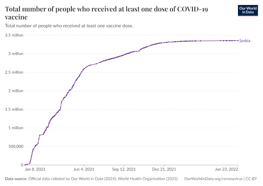 “Data Page: Total number of people who received at least one dose of COVID-19 vaccine”, part of the following publication: Edouard Mathieu, Hannah Ritchie, Lucas Rodés-Guirao, Cameron Appel, Daniel Gavrilov, Charlie Giattino, Joe Hasell, Bobbie Macdonald, Saloni Dattani, Diana Beltekian, Esteban Ortiz-Ospina, and Max Roser (2020) - “COVID-19 Pandemic”. Data adapted from Official data collated by Our World in Data, World Health Organisation. Retrieved from https://archive.ourworldindata.org/20260119-065148/grapher/people-vaccinated-covid.html [online resource] (archived on January 19, 2026).How to cite this data